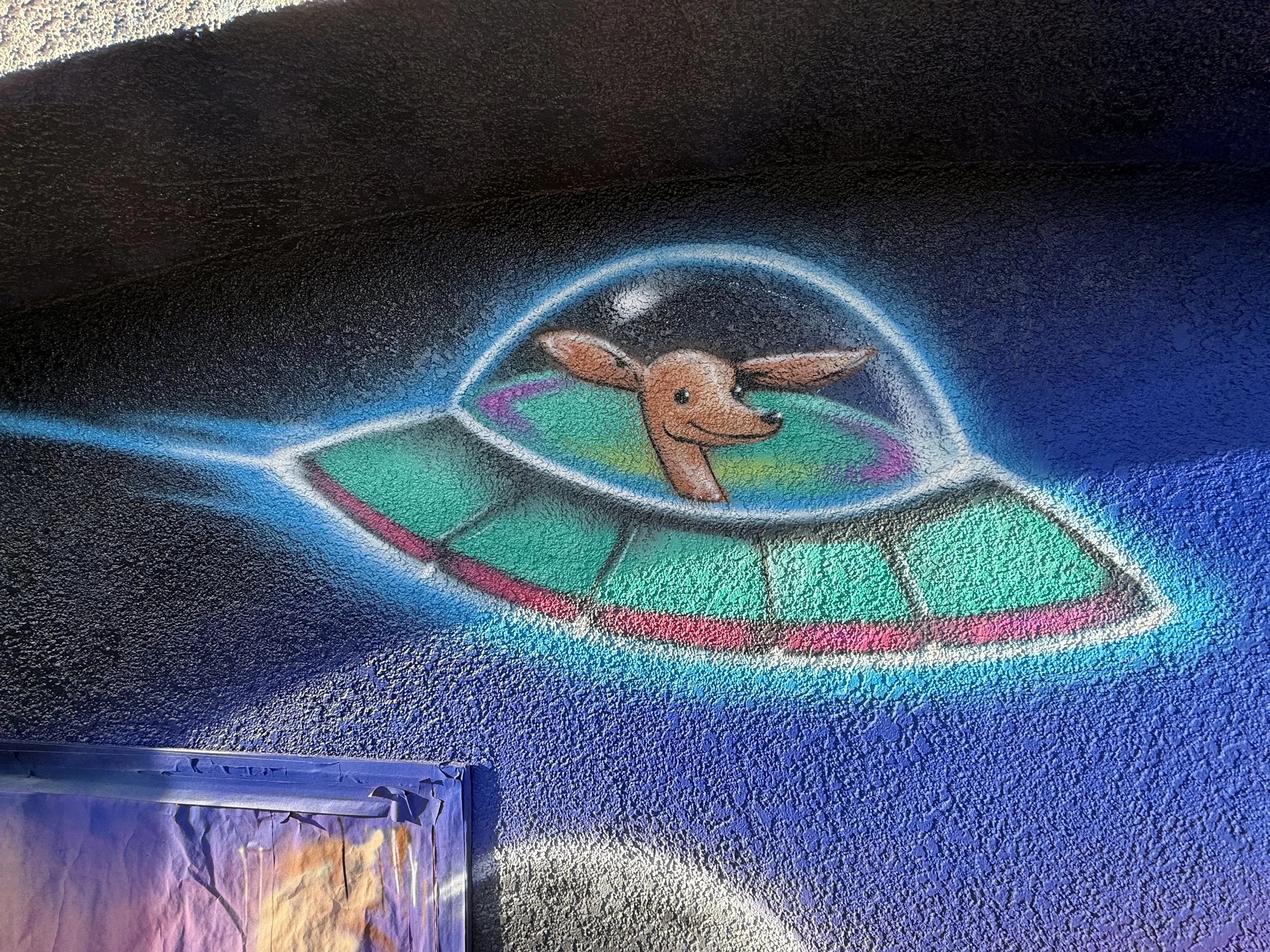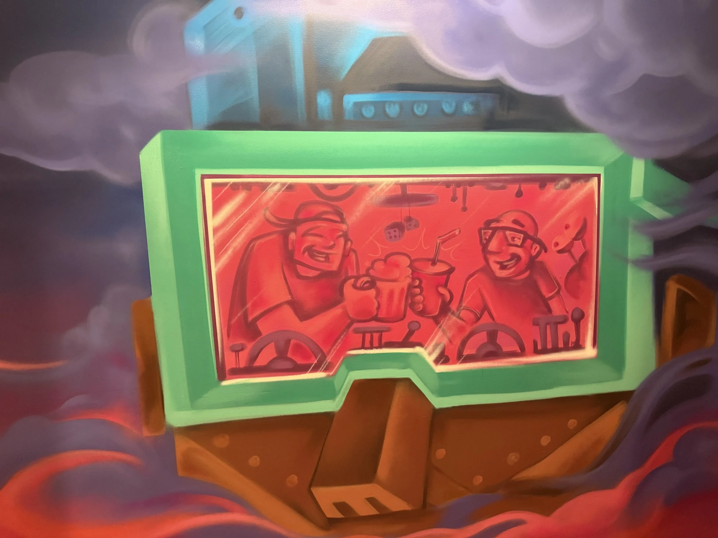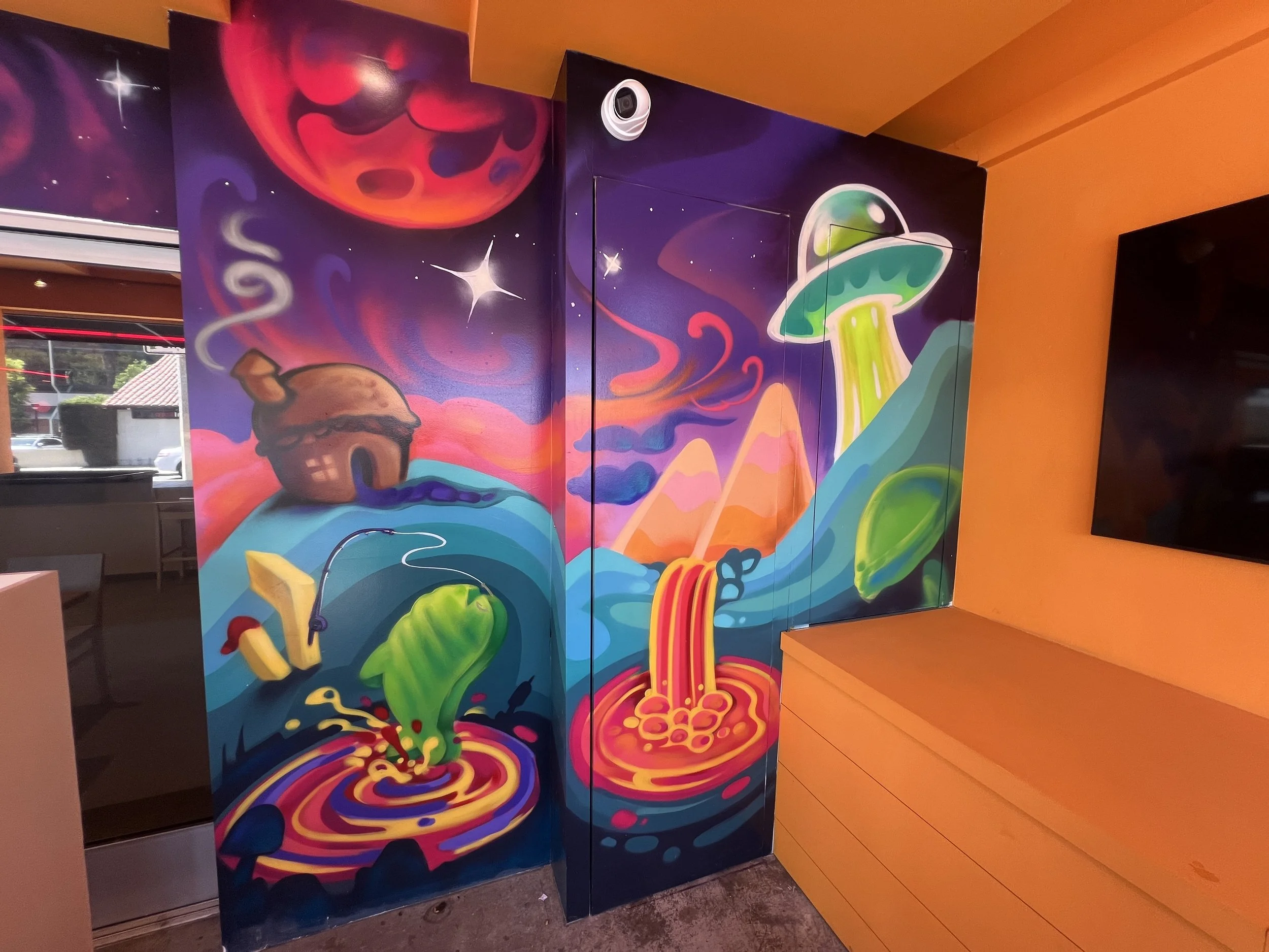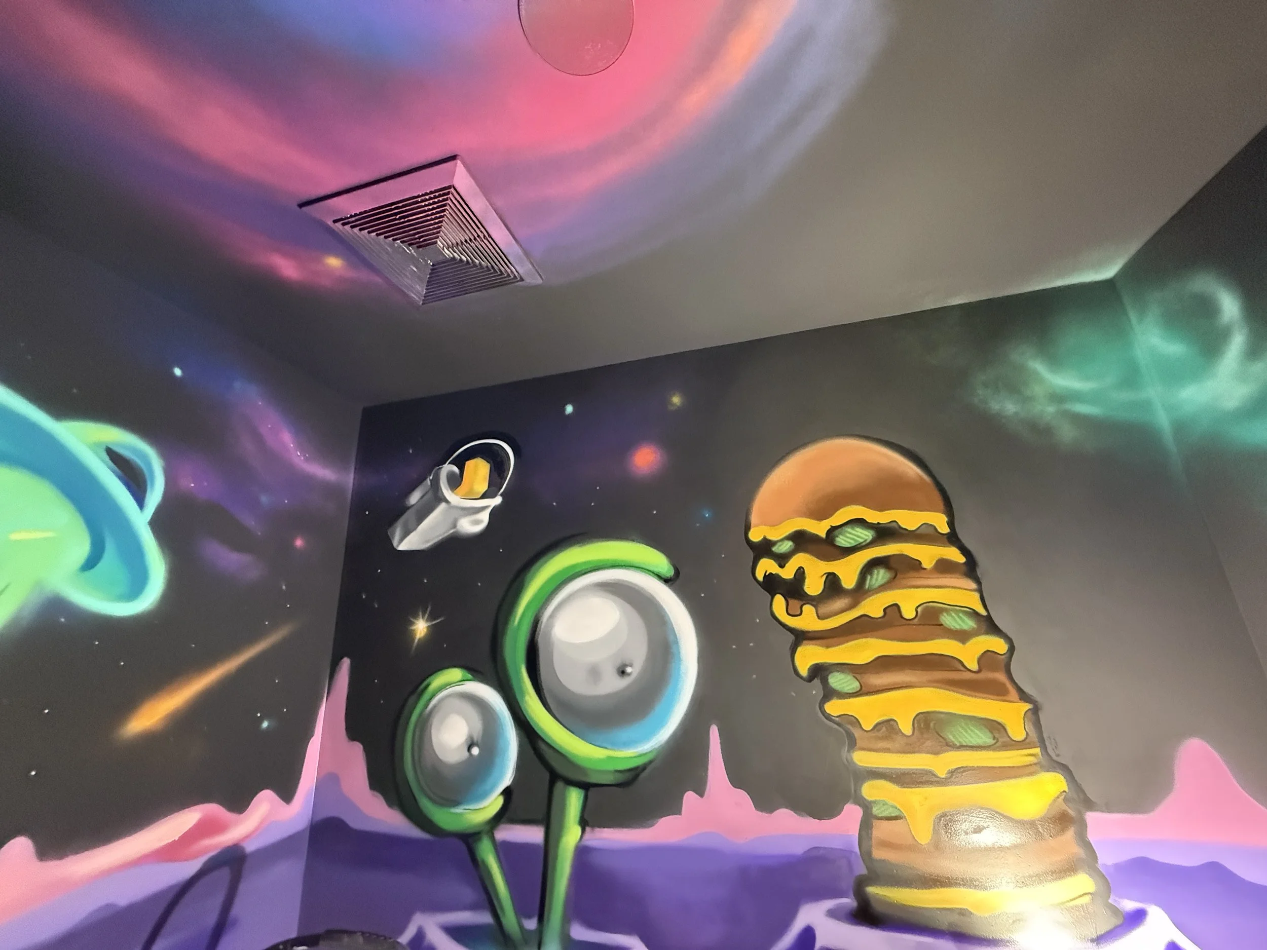 The rest of the restaurant interior and bathrooms were once again a blank canvas. Keeping with the blast off theme, the interior bar of the restaurant has a series of fries enjoying snowboarding on mountaintops of ice cream, as well as Heavy peeking through clouds as he soars into the stratosphere. We see a close up of Max and Danny as they pilot Heavy through his goggles. Inside each bathroom is a different cosmic experience. The first bathroom is the interior of a space station, with views of the galaxy, alien ships, planets, and Heavy orbiting close by. An LA home-run ball was a fun touch. The second bathroom imagines what life would be like on a distant asteriod, inhabited by eyeball monsters, burger worms, and an exploratory mission of fries.