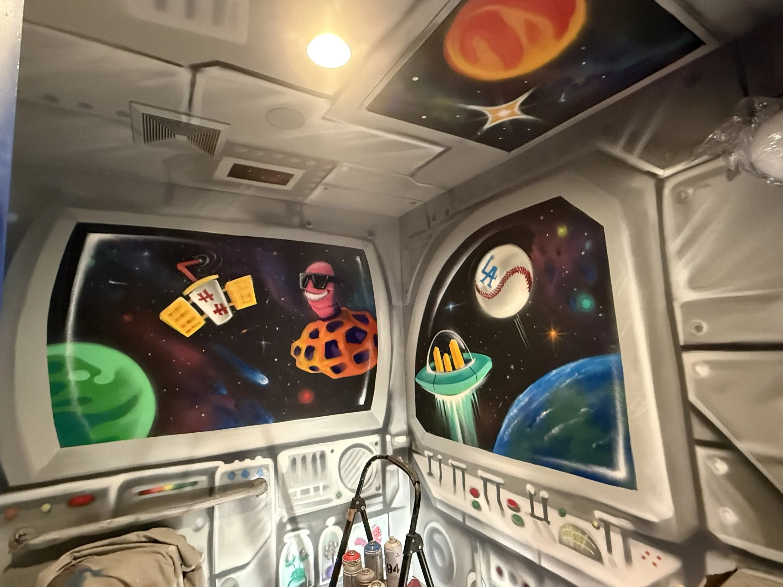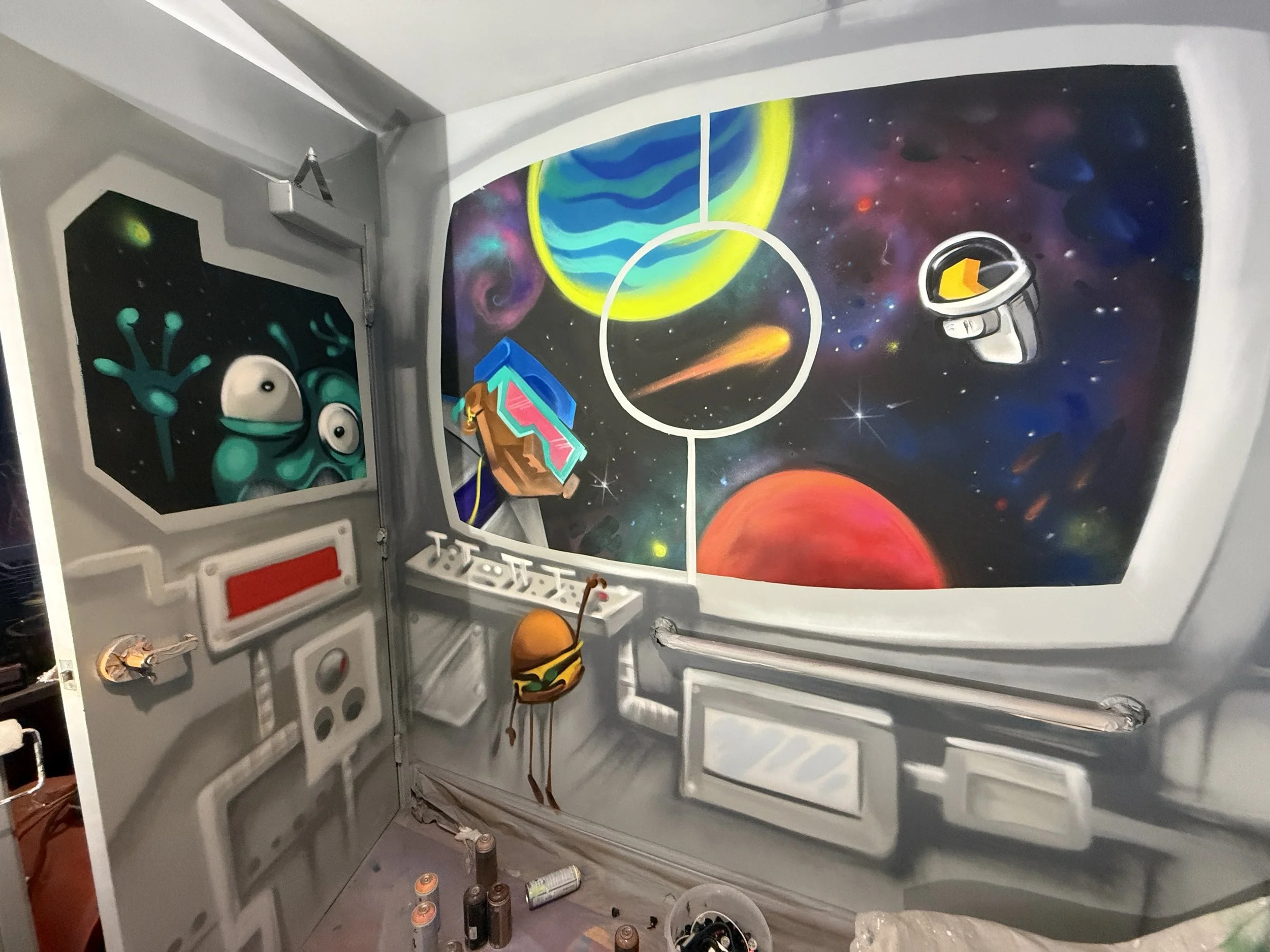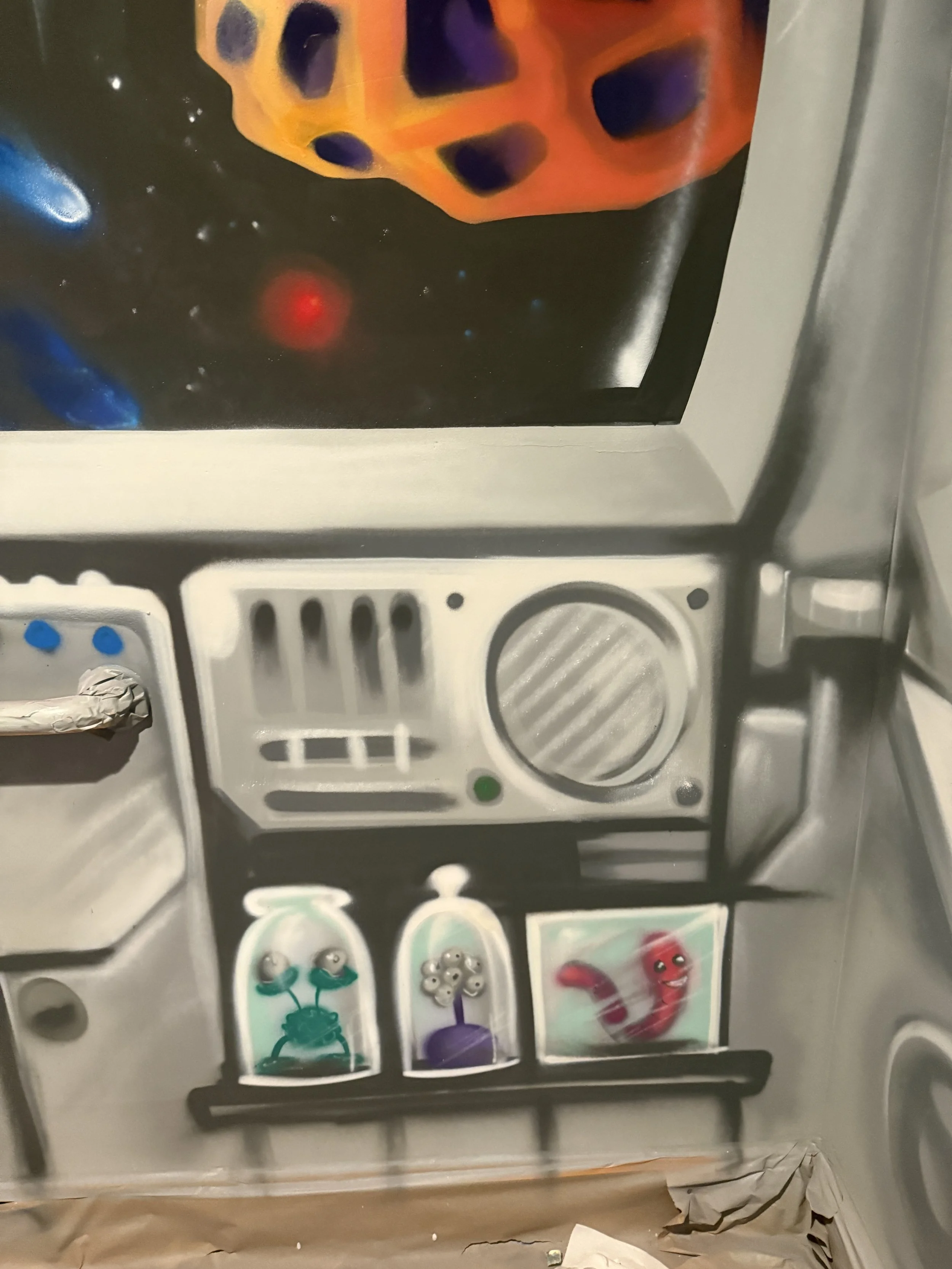 For some of the other areas of the wall, I played around with a world, space, fries that are doing different activities like fishing or scuba diving. Although a ton of work, it was one of the most exciting projects I’ve completed ever. It feels so good looking at the finished results and having a client that gave me complete creative freedom.