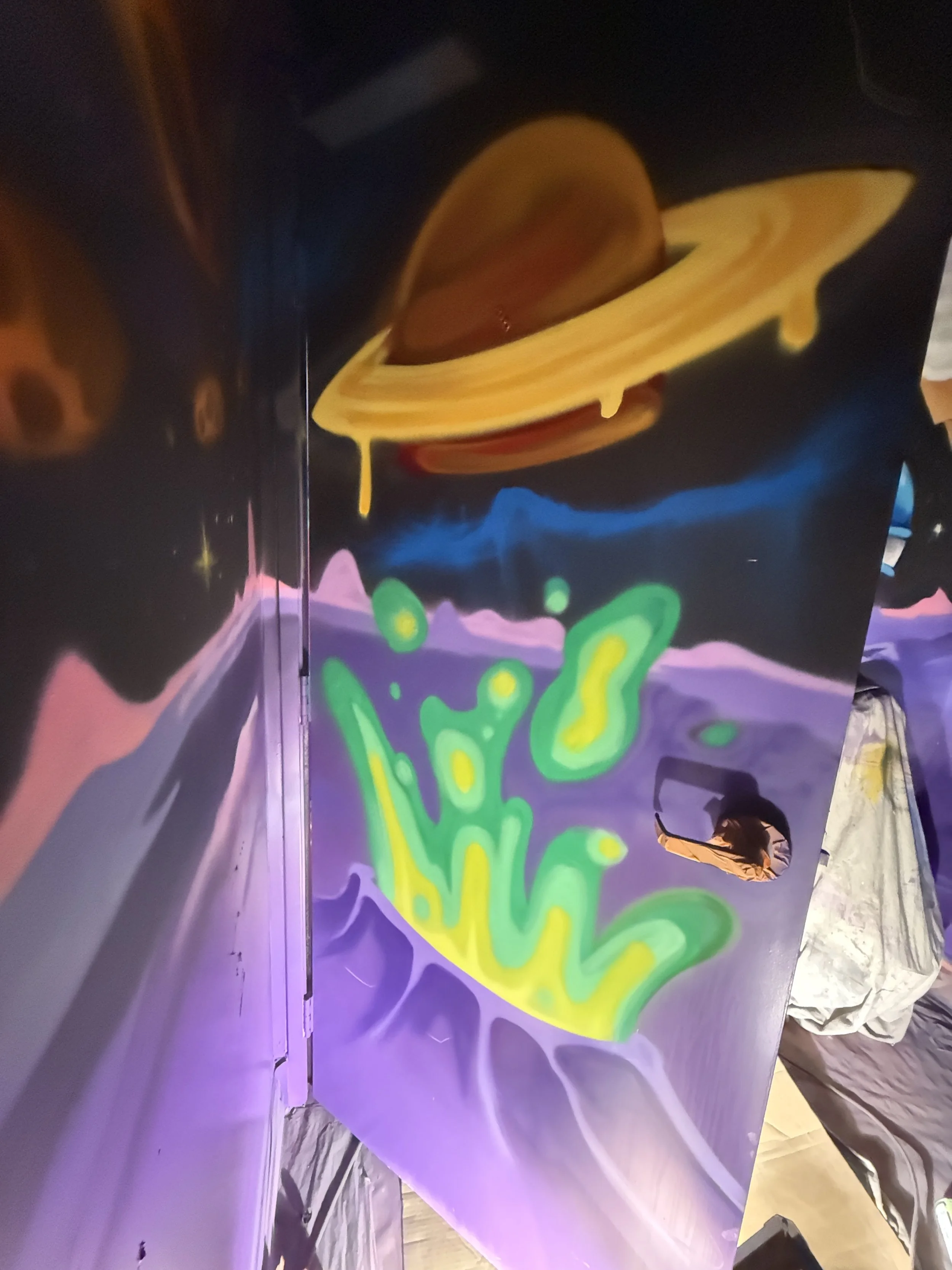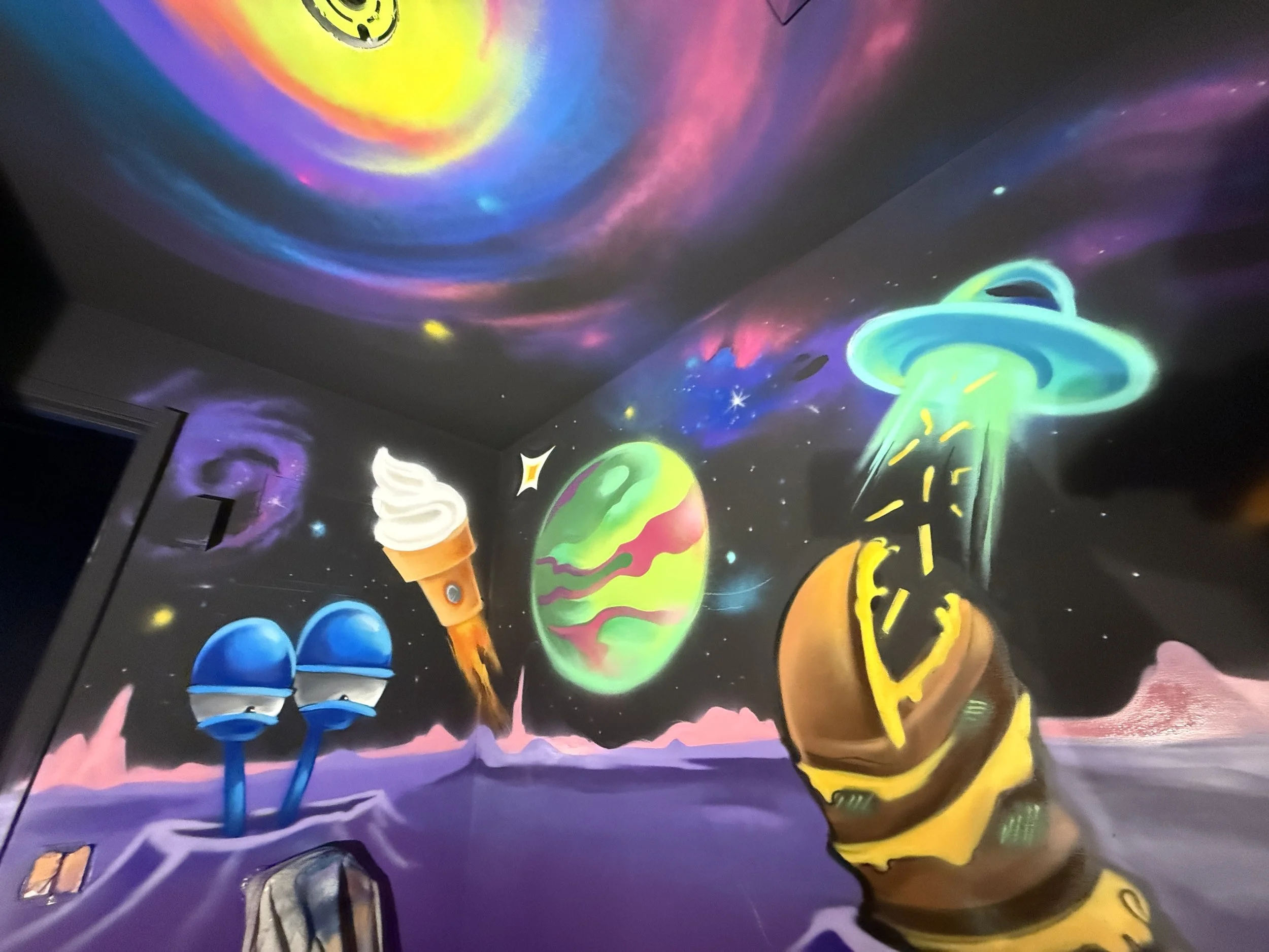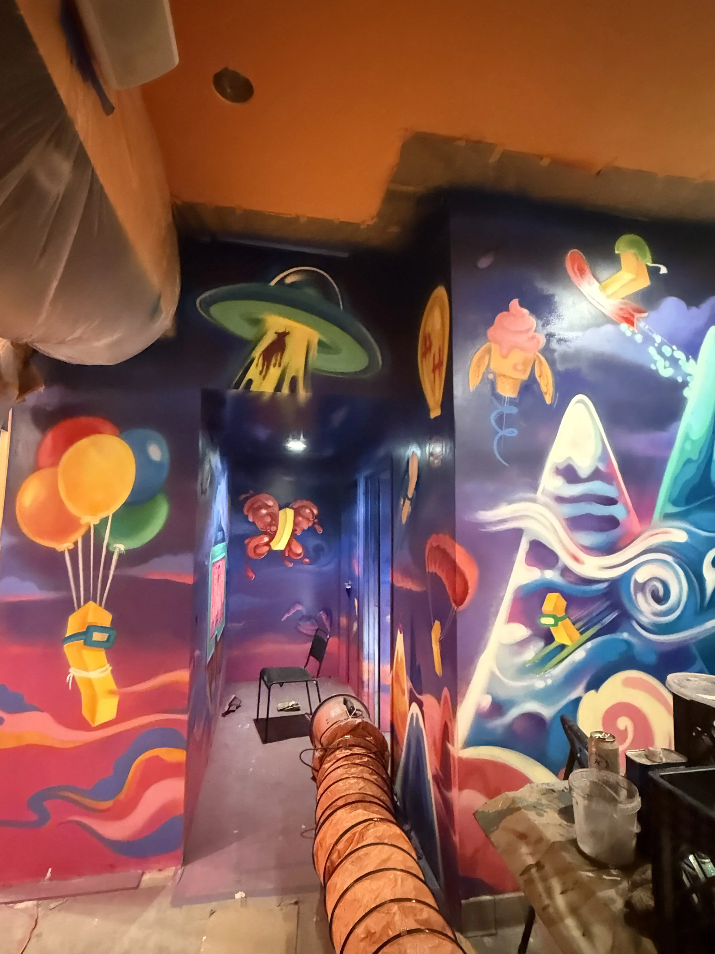 For some of the other areas of the wall, I played around with a world, space, fries that are doing different activities like fishing or scuba diving. Although a ton of work, it was one of the most exciting projects I’ve completed ever. It feels so good looking at the finished results and having a client that gave me complete creative freedom.