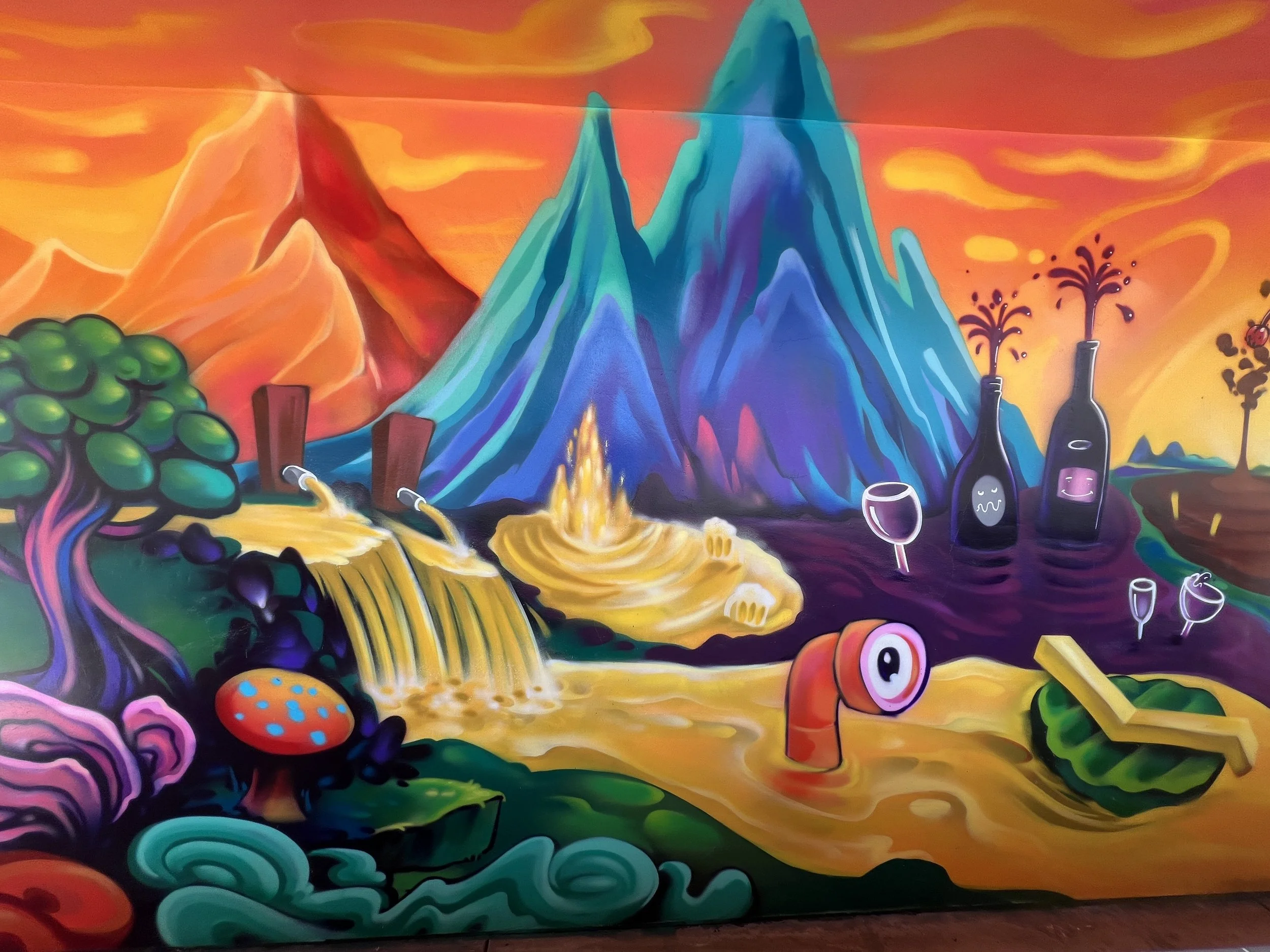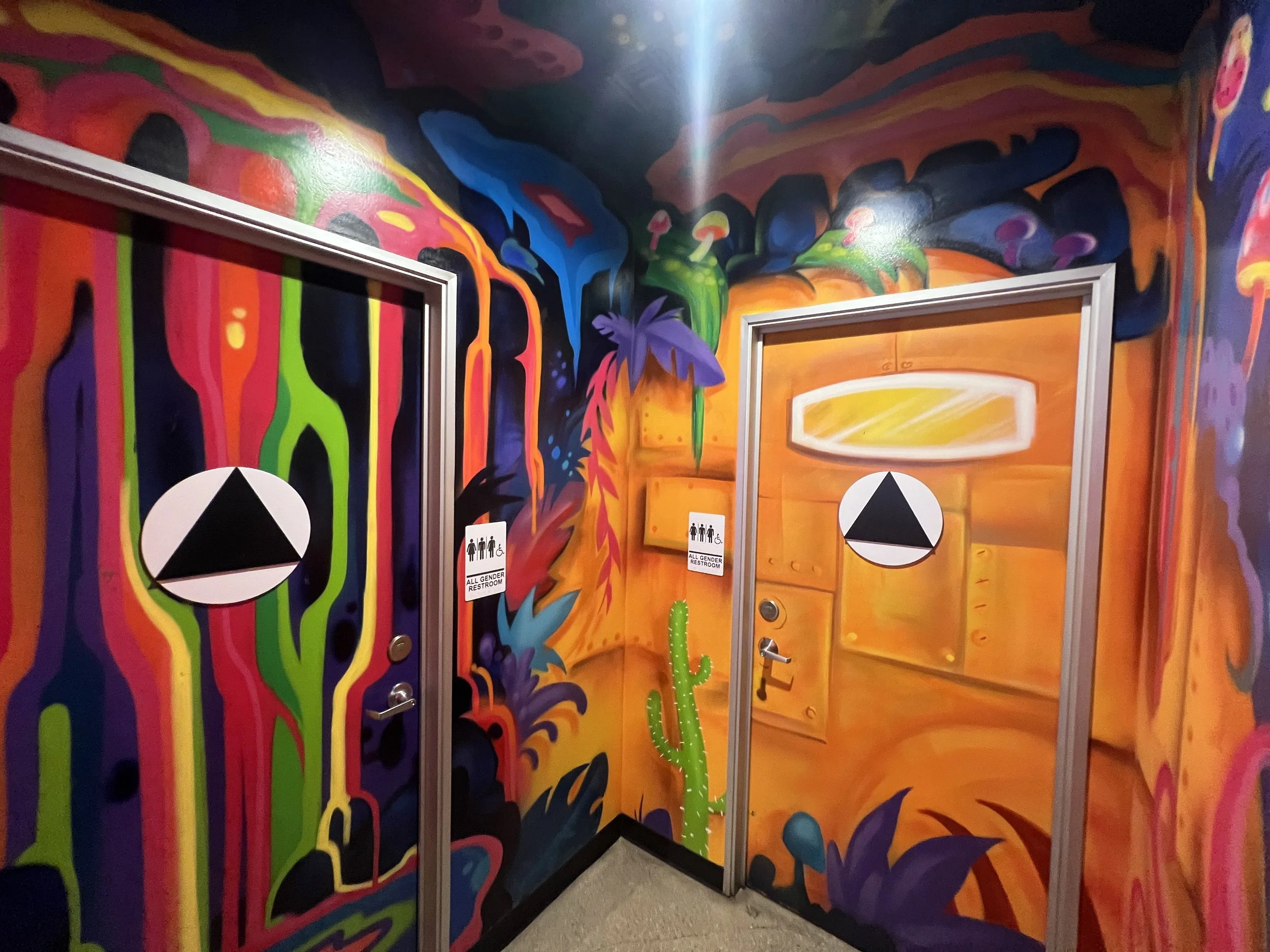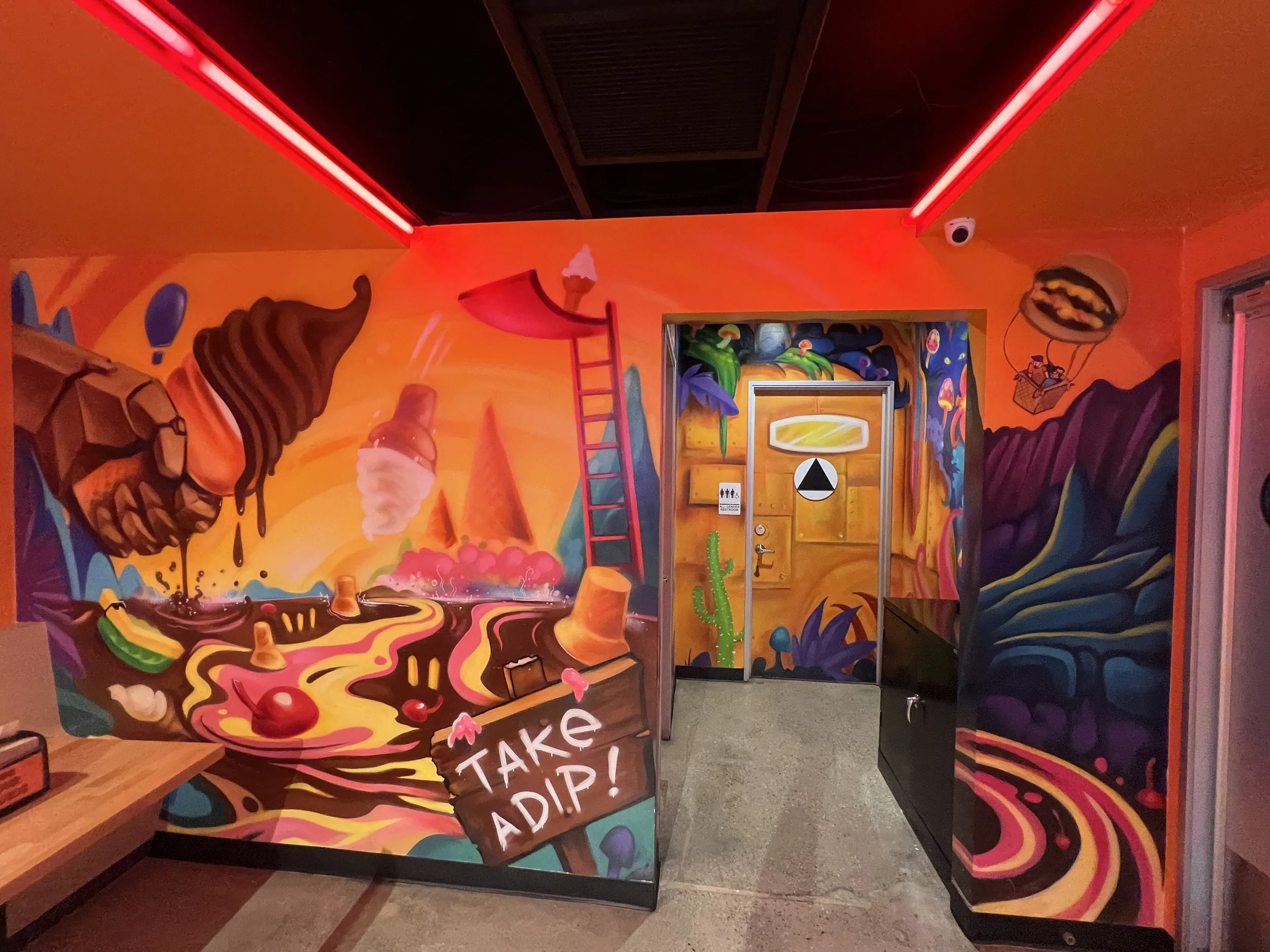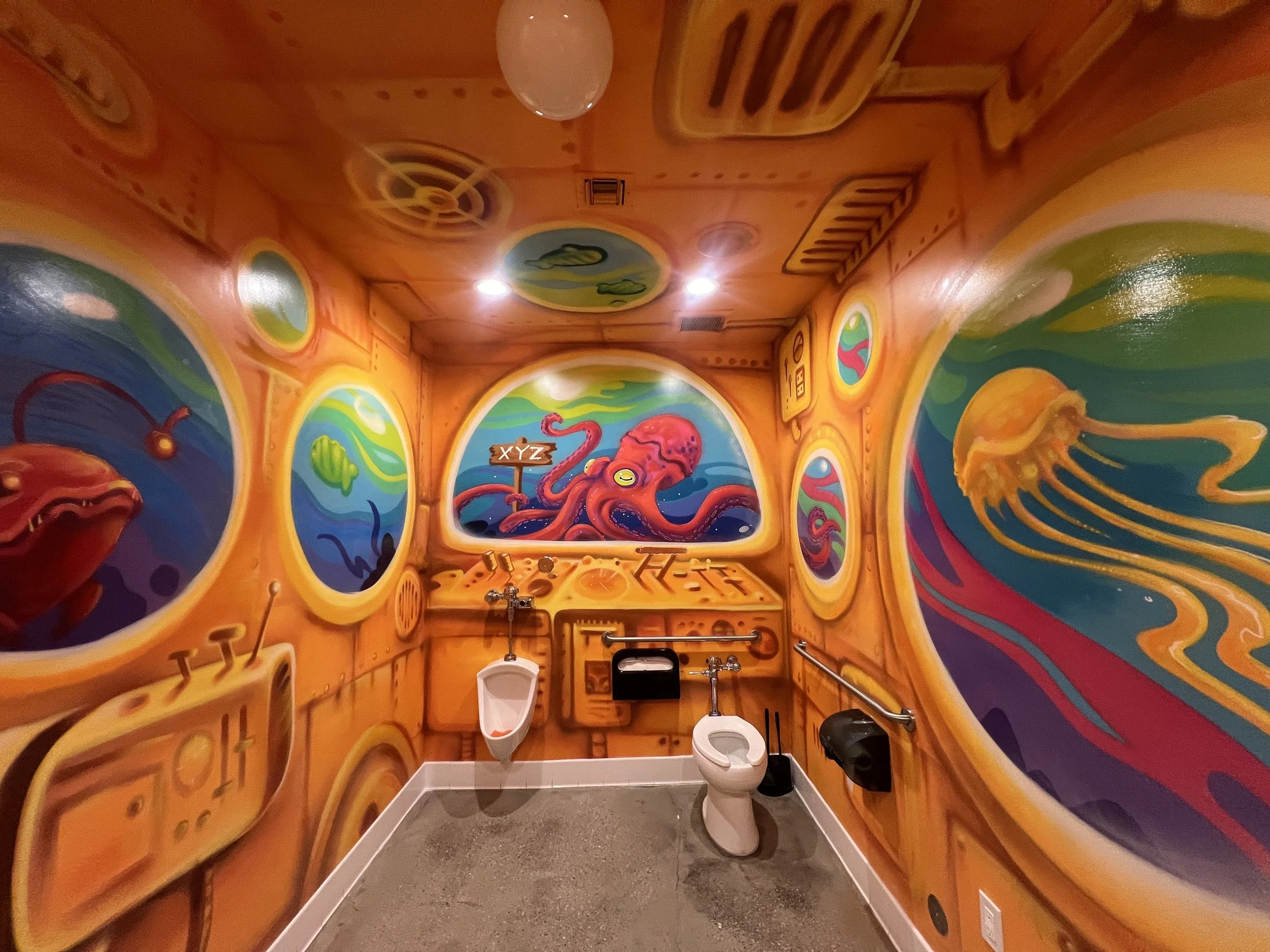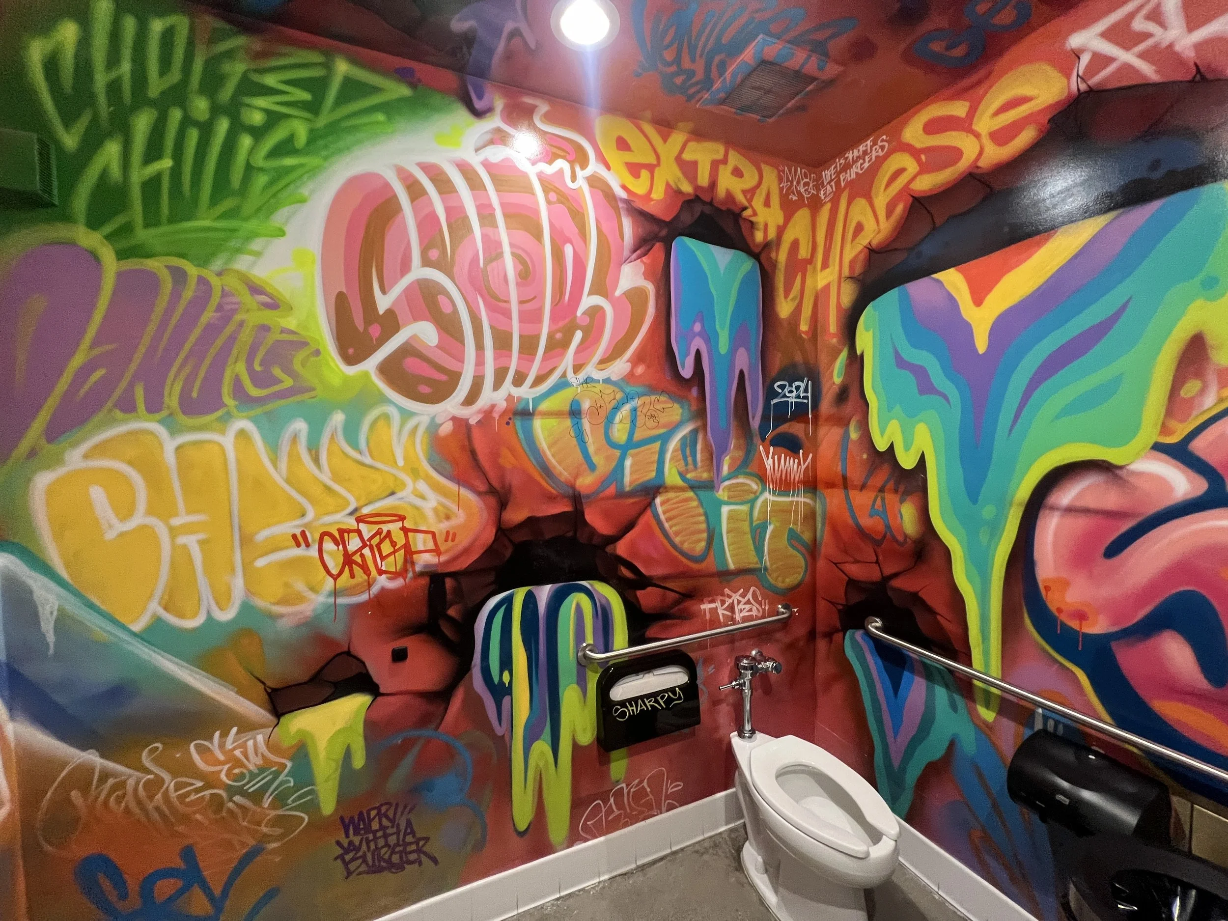 There was a lot of area to cover inside and outside the restaurant, including the bathrooms, which was a first for me to paint a bathroom. But when you think about creating an unique experience, a bathroom can be a totally fun and immersive place to do something new and exciting. And in this case, for the largest restroom, I thought making it look like the inside of a submarine, underneath the colorful rivers of the burger wonderland. For the other bathroom, we thought doing an graffiti covered cave could be cool, using key words from their brand, I layered tags everywhere. We also thought If people tag the restroom it would be cool, just more art layers.