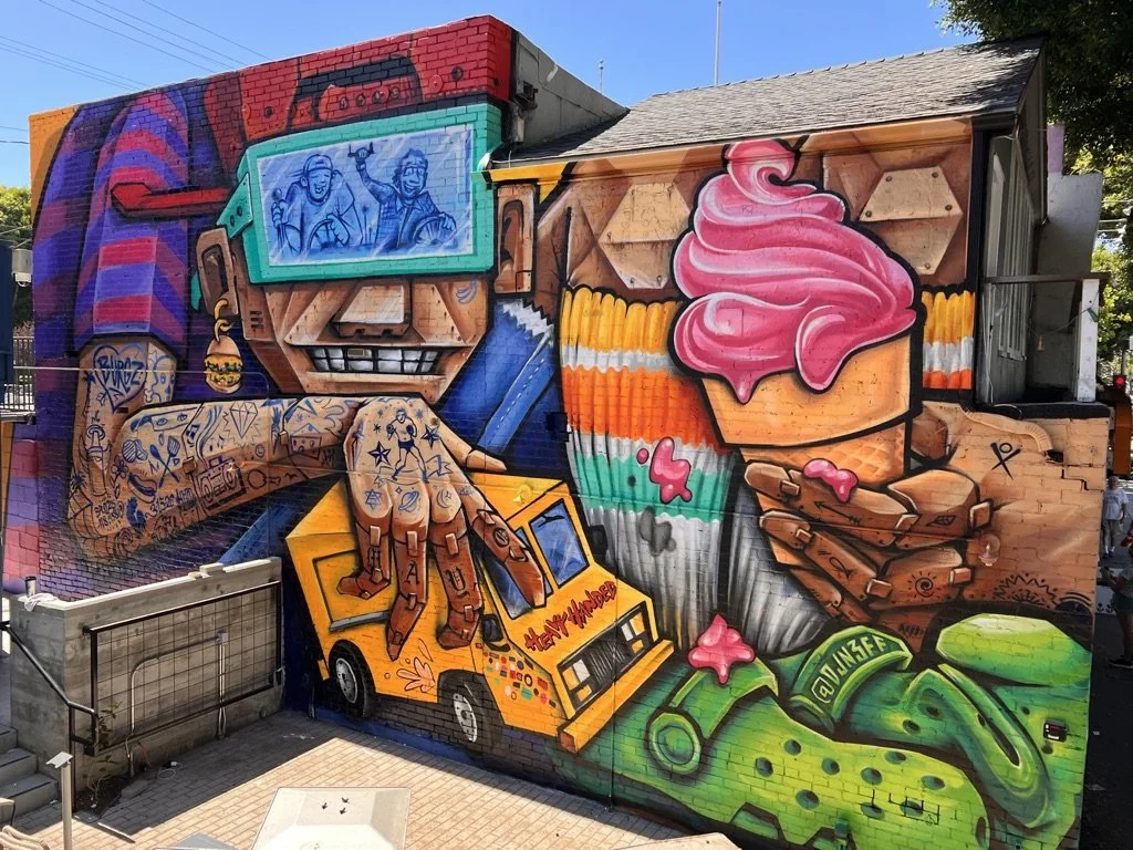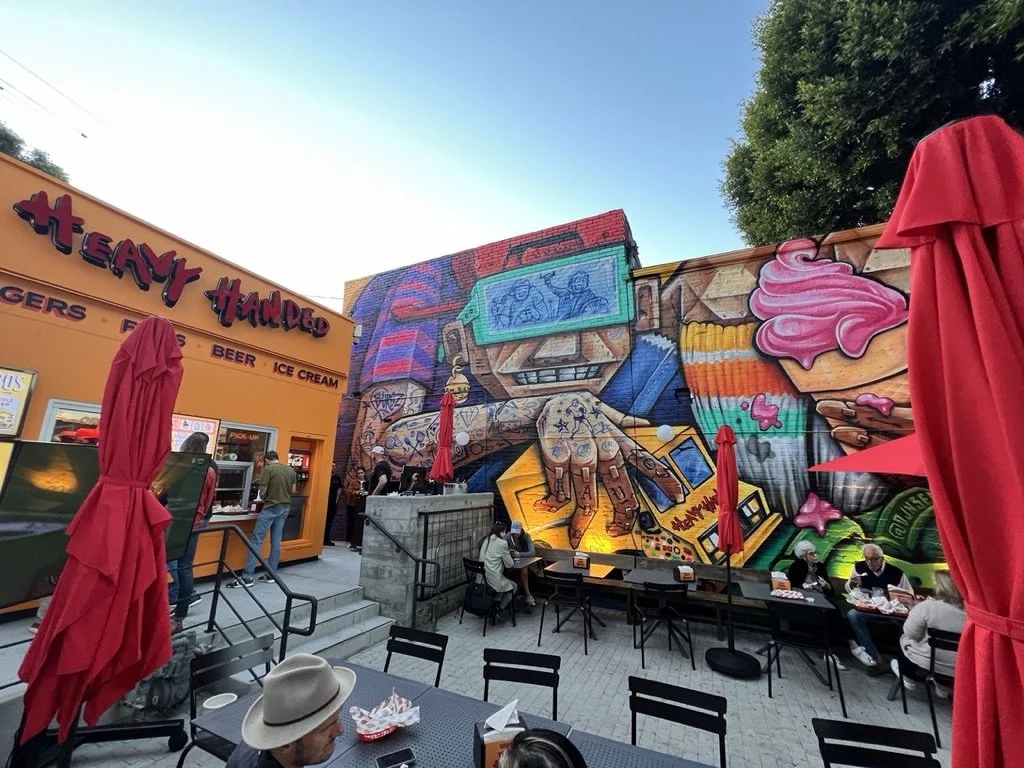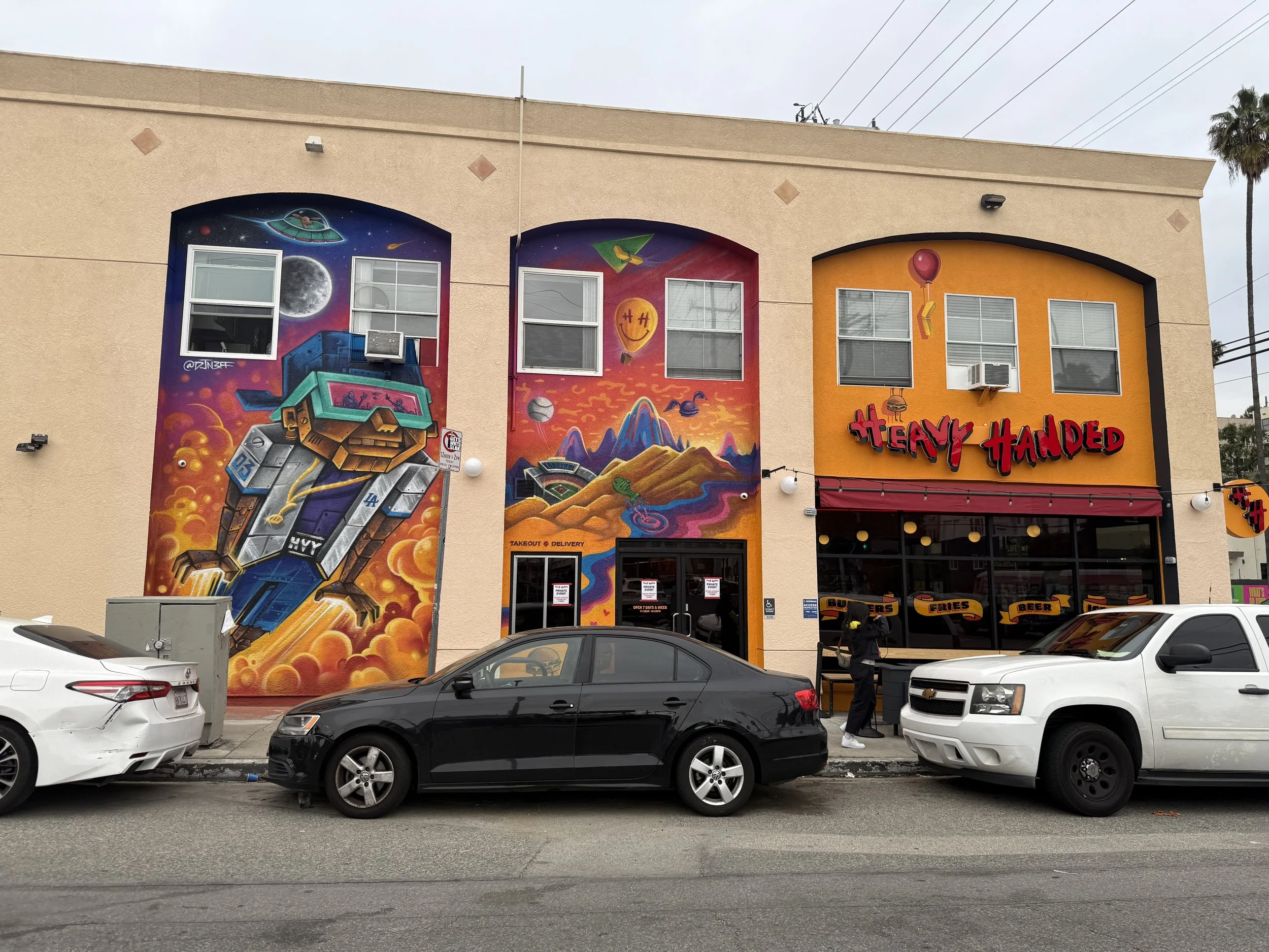 Description : It’s not often the perfect client exists, but I can truly say the fellas at Heavy Handed are not only some of the coolest people I have ever had the pleasure of working with, but they have given me the gift and freedom to absolutely go nuts for their restaurants. So far I have painted every square inch of free space at 3 of their highly successful restaurants. It all started in Santa Monica, with a unique outdoor wall space, in which we really wanted to make a big visual impact on Main street.