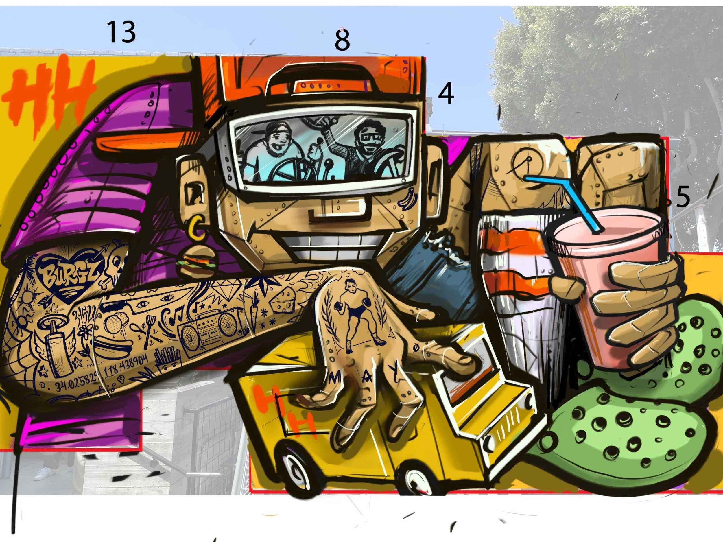 They wanted something that gave the space a wow factor while also having some meaning to their business journey. They started making burgers as a pop-up tent during covid, and after some time started with a big yellow food truck, and a year later this was their first brick and mortar. I came up with the idea that as an evolution of their burger franchise in the future, maybe they built a homemade robot that they drove around. They loved the idea, and said, can he be playing with the food truck. I said of course! I also said we can give the robot tattoos for all the significant details as to your business history. Like the GPS of their first popup or the logo of the Brig, a bar they parked their truck for weekends.