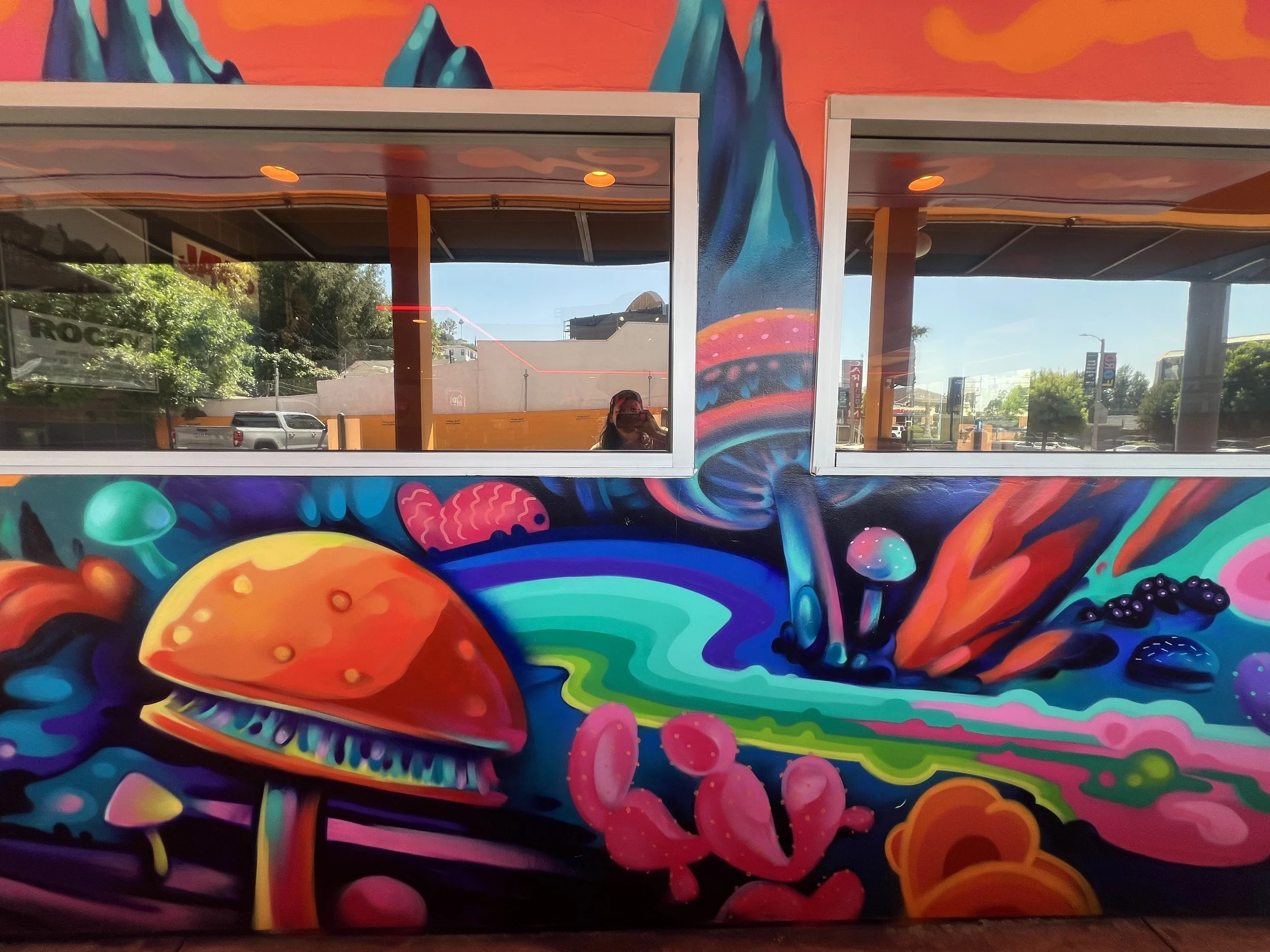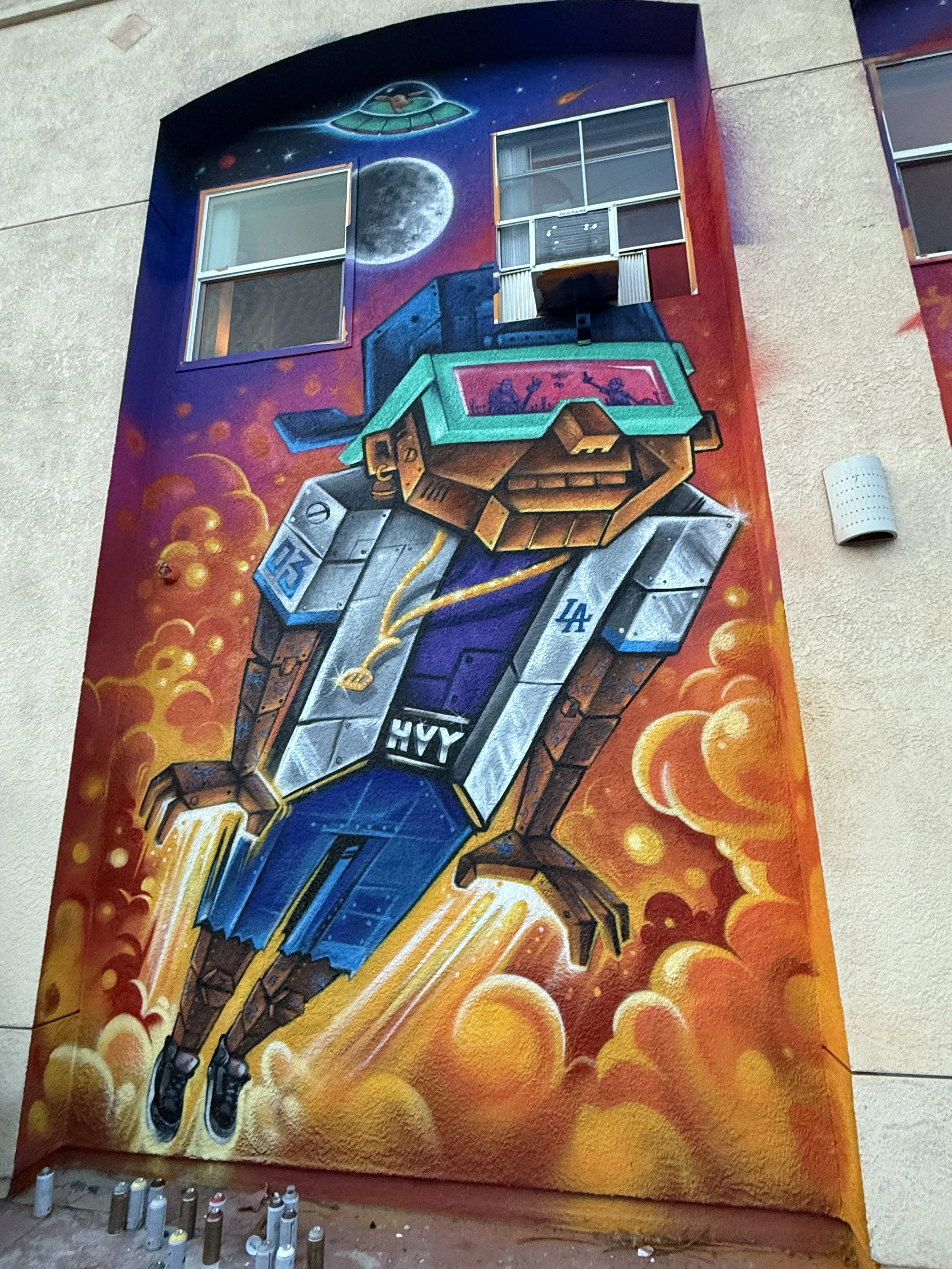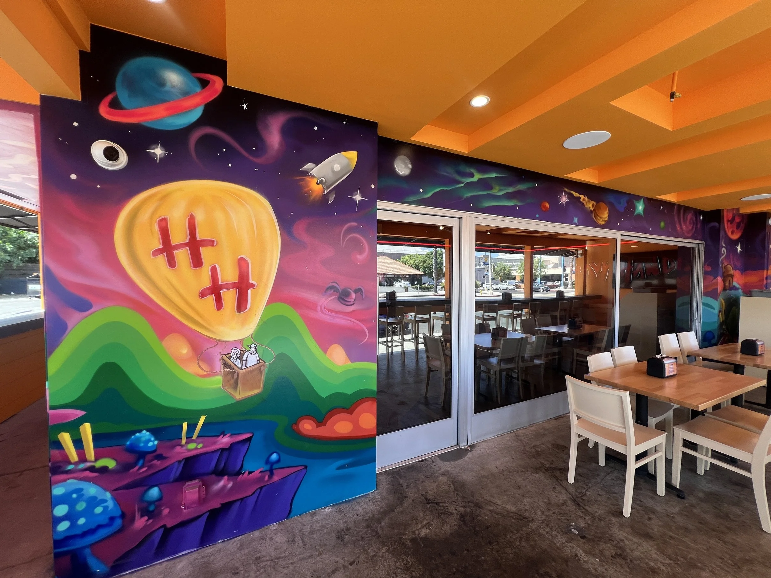 Description : I’m so proud of Max and Danny, just crushing it, and for the third restaurant, we worked together to transform a totally unique space in Echo Park. The front of the building had some interesting shaped recesses for the Mural to live. Being as this was the third restaurant, in trying to think of a concept It felt like their brand was really blasting off. So it turns out Heavy has blaster jets in his hands, and his Jordan 3’s. We thought it would be cool showing him blasting off into new horizons, just as their franchise is going to new heights. In addition, this was a location really close to Dodgers Stadium, so as an homage to the home team, he dons a new LA baseball jersey fit with blue cap. We see Heavy blast off from the burger world we know from the second restuarant and into the stars.