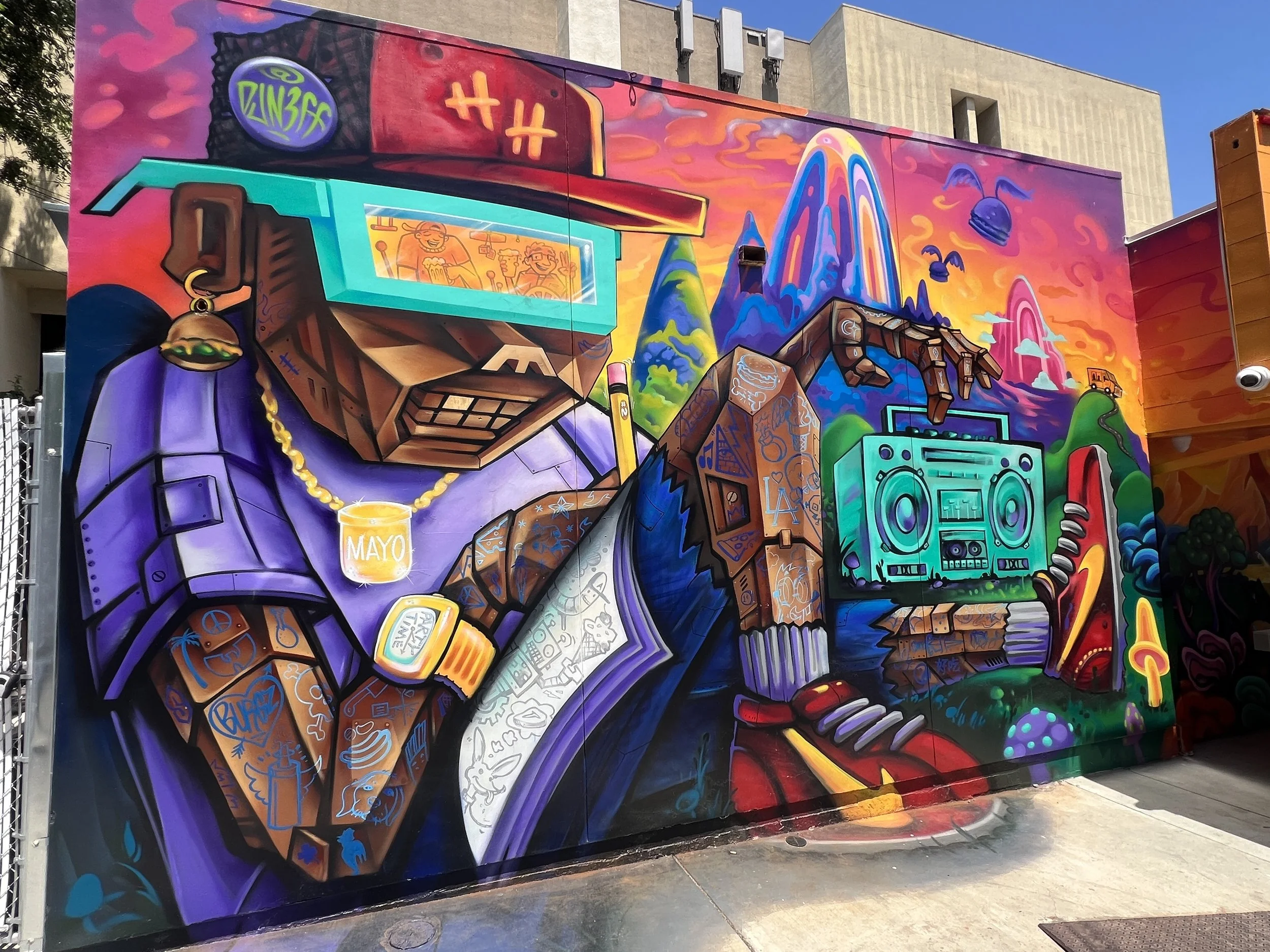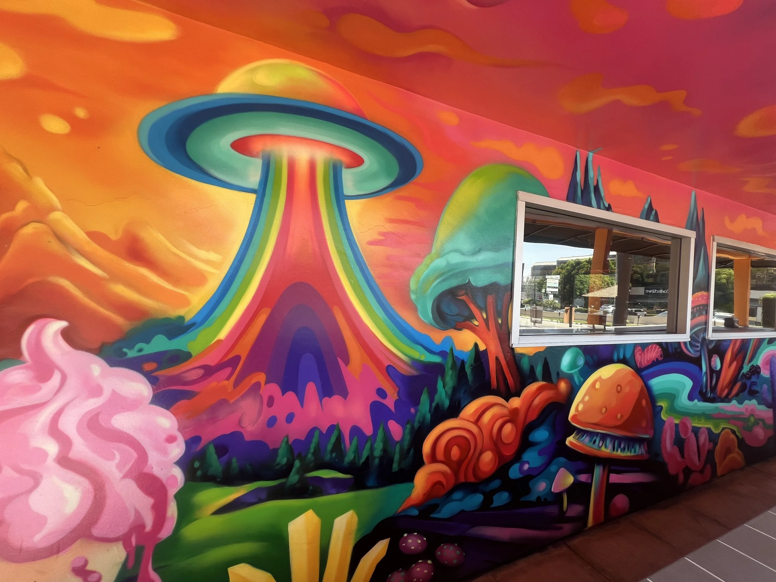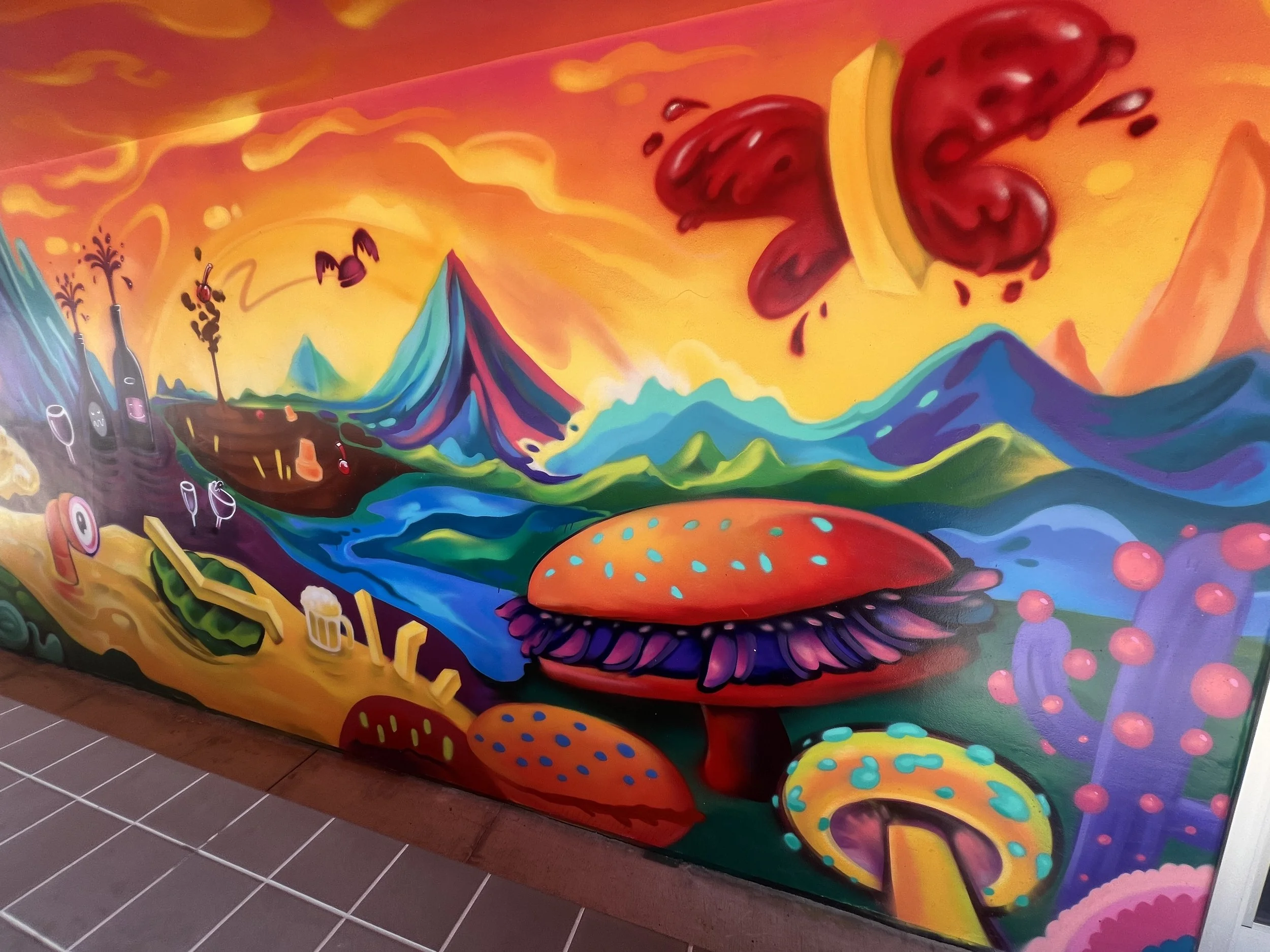 The mural was a huge hit, literally, and “HEAVY” the robot was born. As they kept opening restaurants, we treated each as a new adventure for HEAVY in a psychedelic burger world.