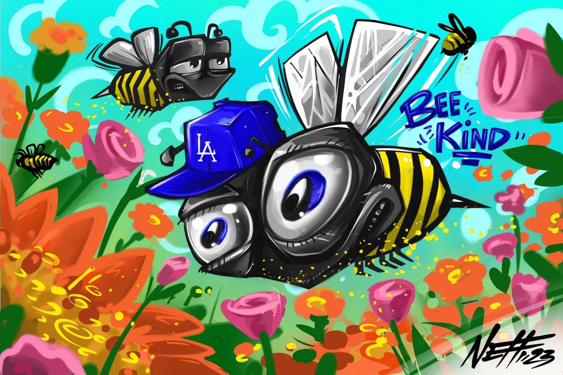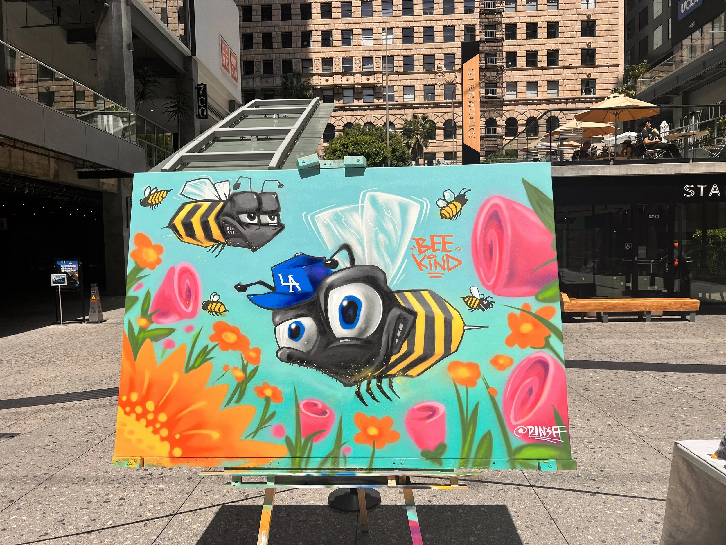 To unveil the artwork on the cans, The Bloc commissioned a special Earth Day Live Painting. I thought It would be fun to bring some awareness to bees. These particular bees are Dodgers fans, and happen to be a little drunk on pollen I guess.