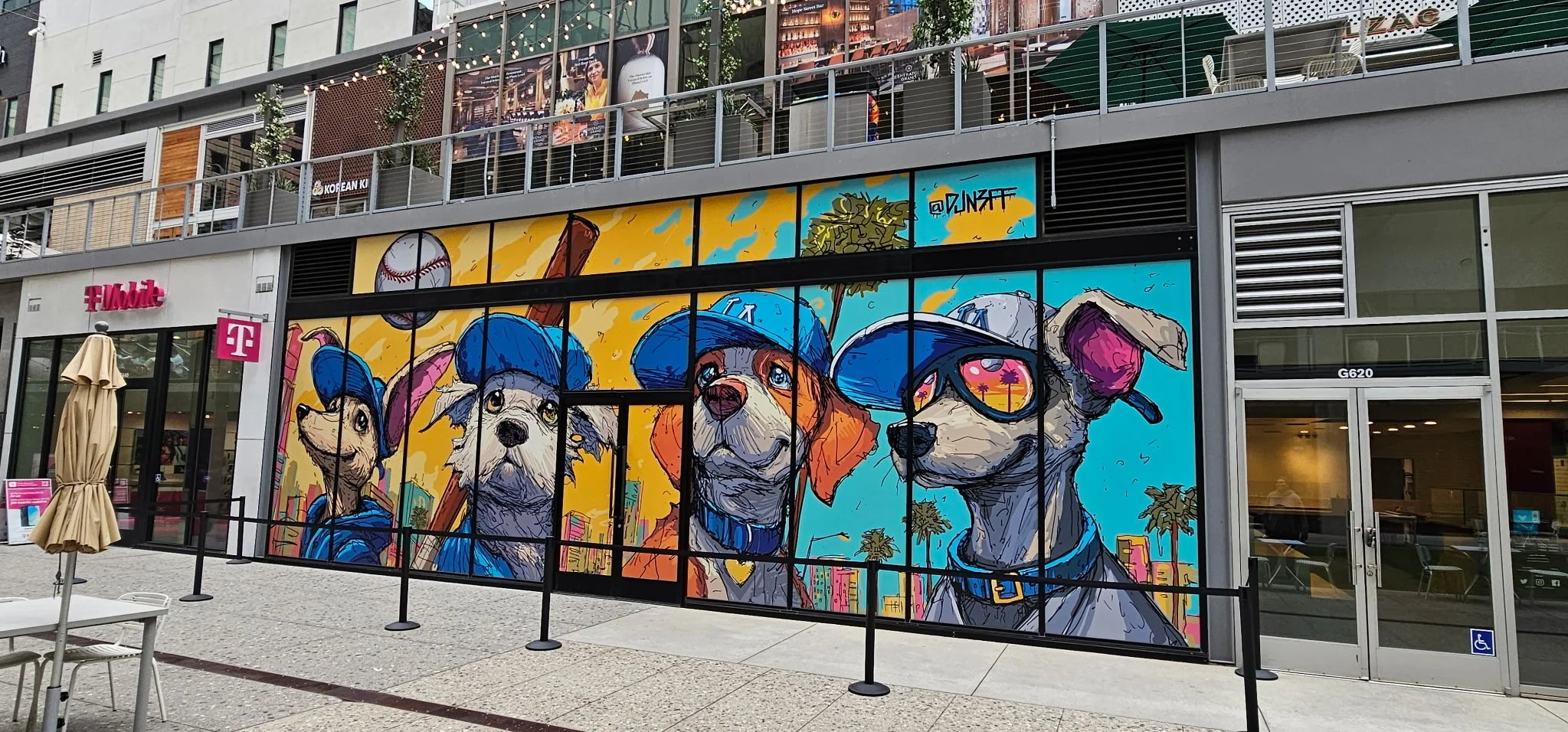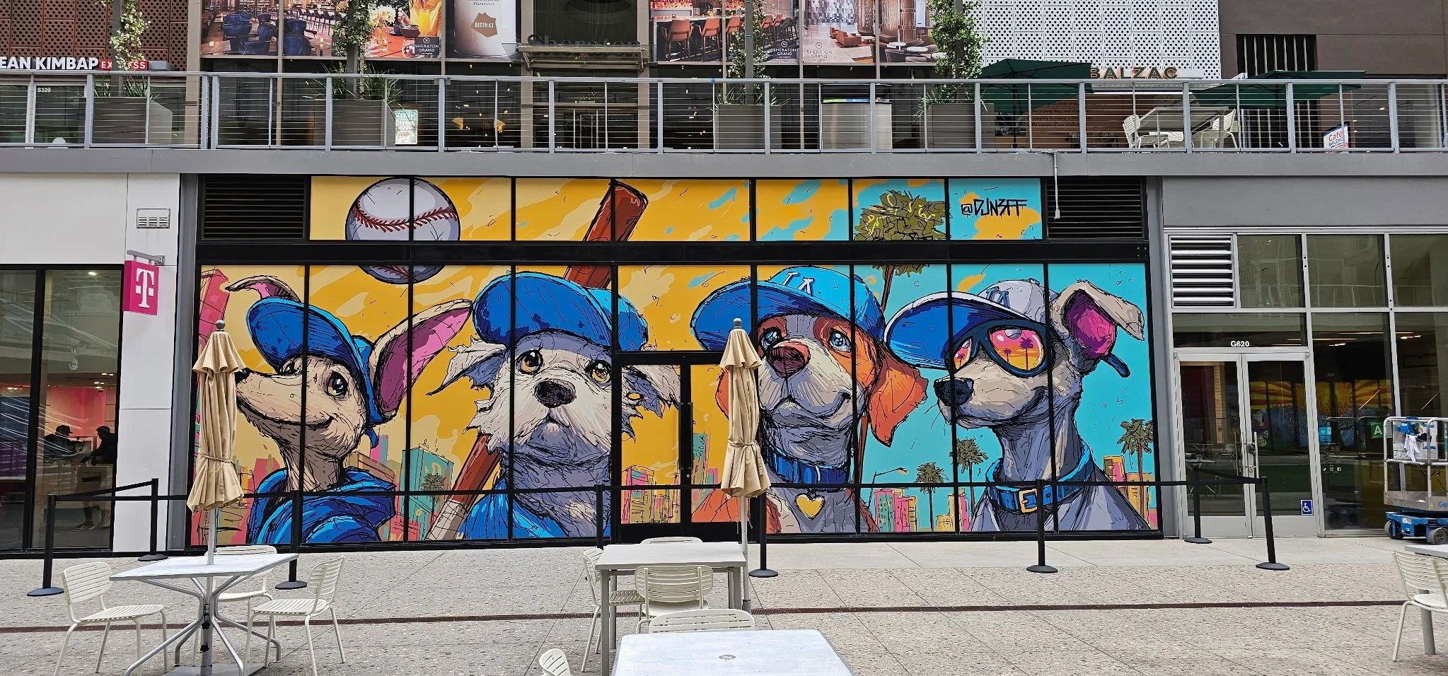 Our latest project was to do a large scale window installation in the theme of the LA Dodgers. Since the Bloc is a big destination for folks visiting for Dodgers games, they thought it would be fun to play with the idea of Dodger Dogs and what that might look like.