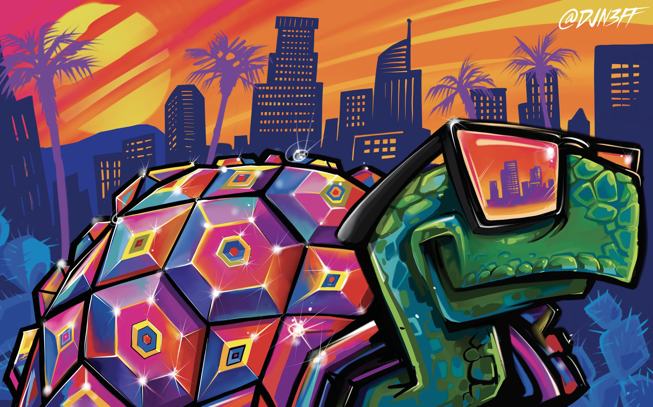 I had this very jeweled desert tortoise drawing that needed a good home. After some back and forth with the client we made him a little more LA with some glasses and the skyline in the back. Funky Fresh.