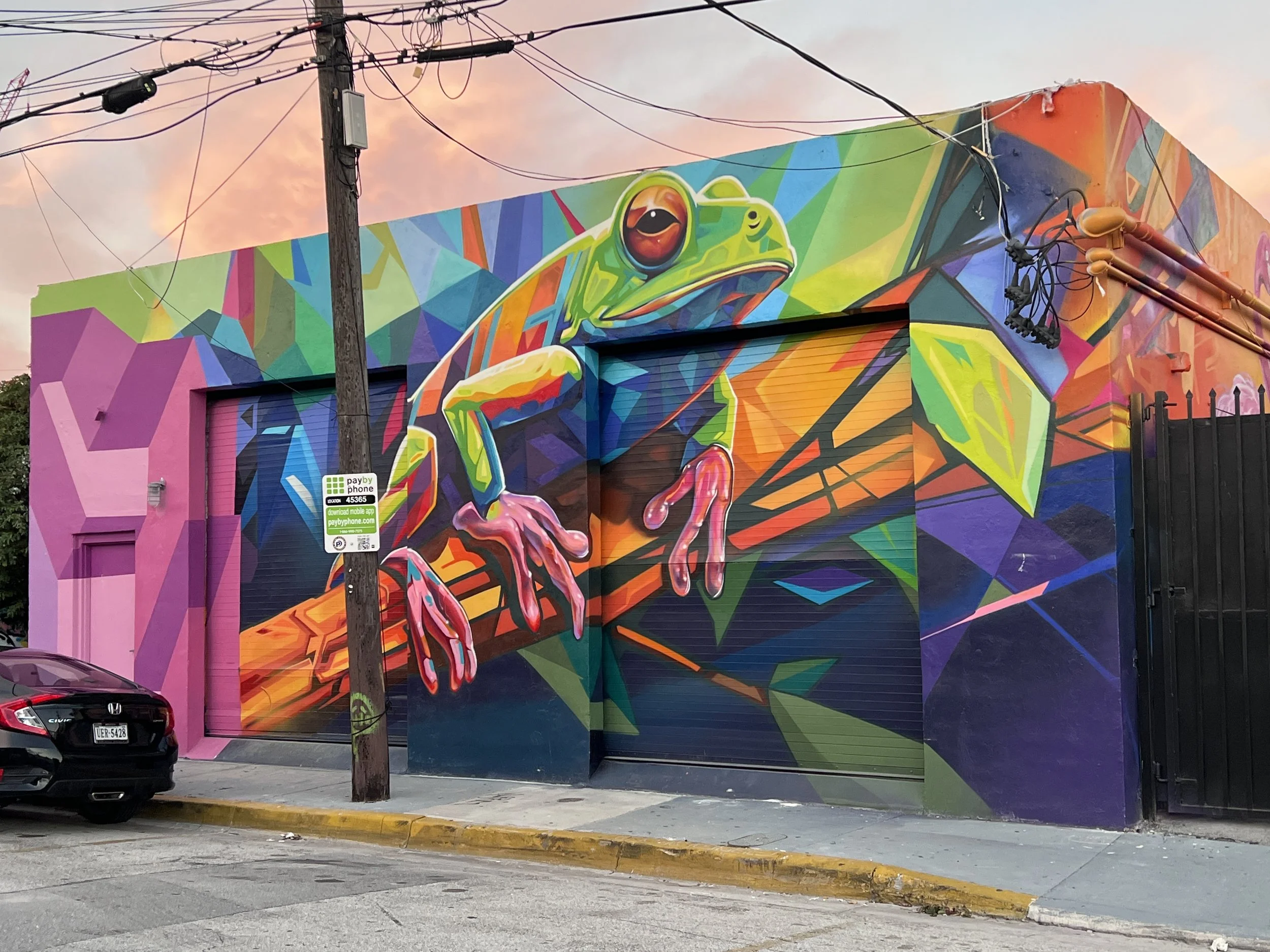 Krave was the bird wrangler, creating the flamingo and parrot walls, and I was the frog handler, creating the tree frog composition. Tubs did his geometric work in areas along the edges of the composition to create a unique juxtaposition.